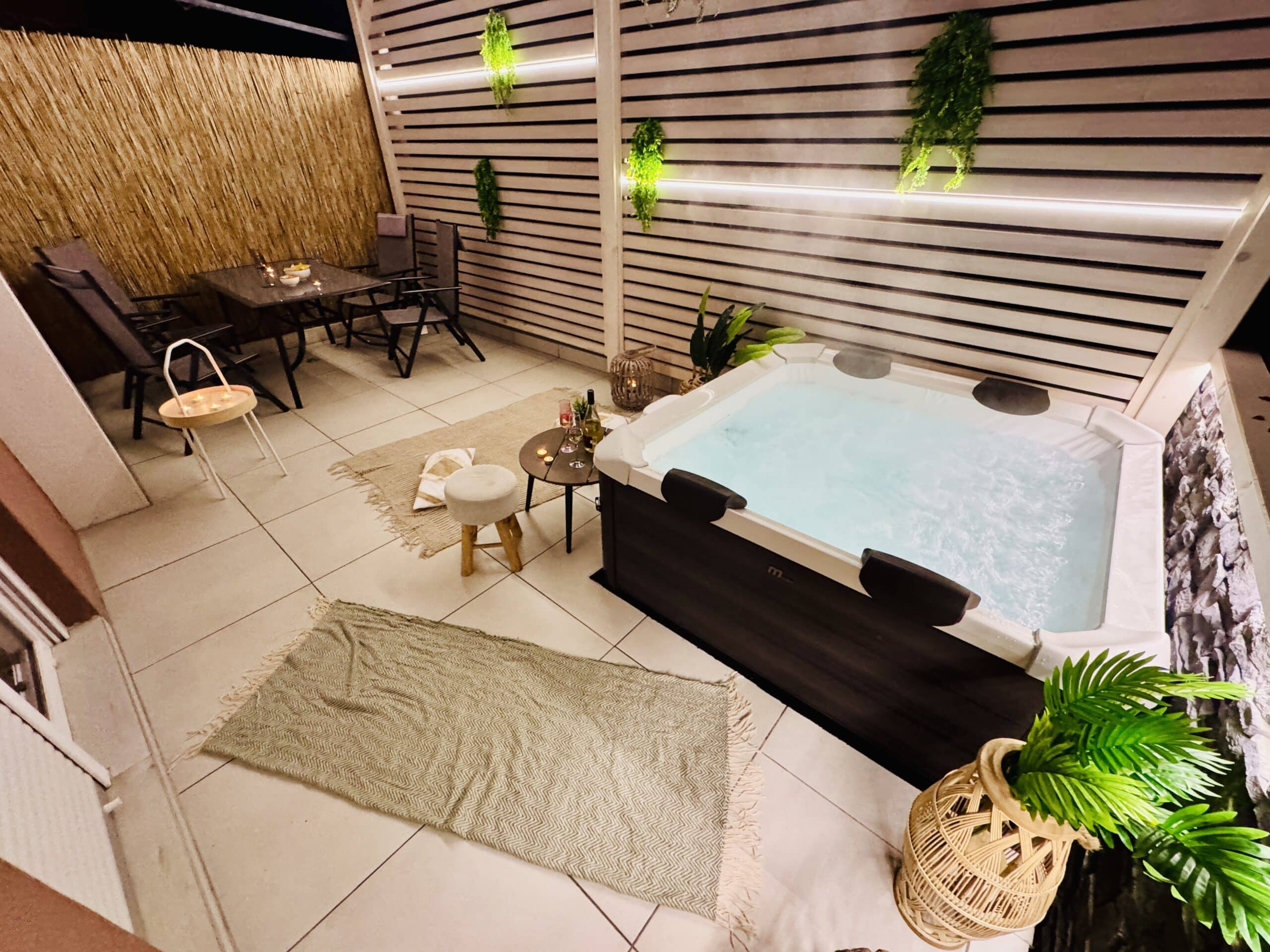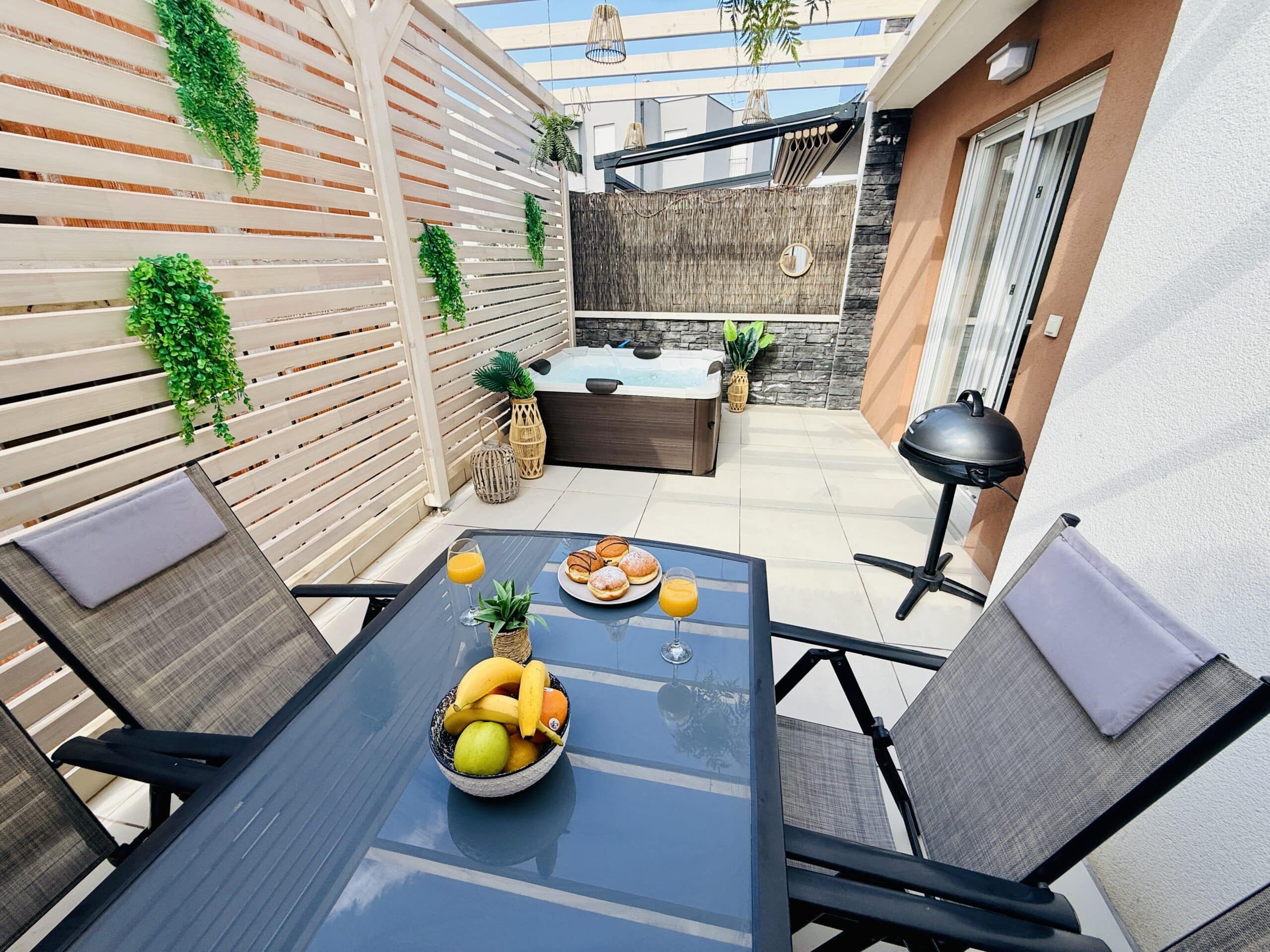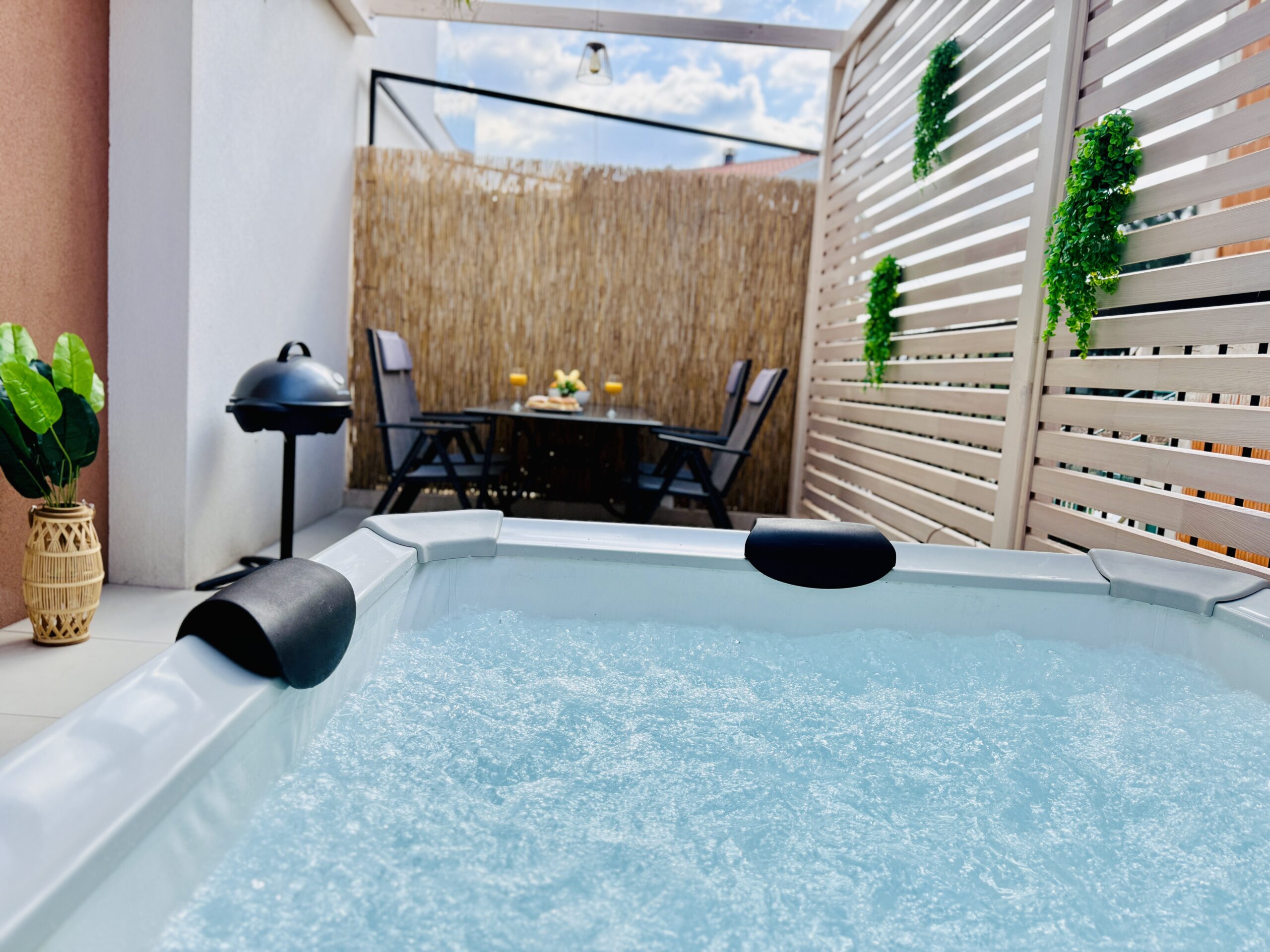 Celoroční dvoupatrový apartmán Happy Home (80 m²) nabízí vše, co potřebujete pro pohodovou dovolenou. V přízemí najdete plně vybavenou kuchyň, útulný obývací prostor s rozkládacím gaučem, koupelnu s WC a hlavně naši zbrusu novou terasou s privátní vířivkou až pro 6 osob. Nová podlaha, pergola, světýlka, zelené detaily a vůně moře vytvářejí jedinečnou, romantickou atmosféru – ideální pro večerní relax při sklence vína nebo ranní kávu v bublinkách.