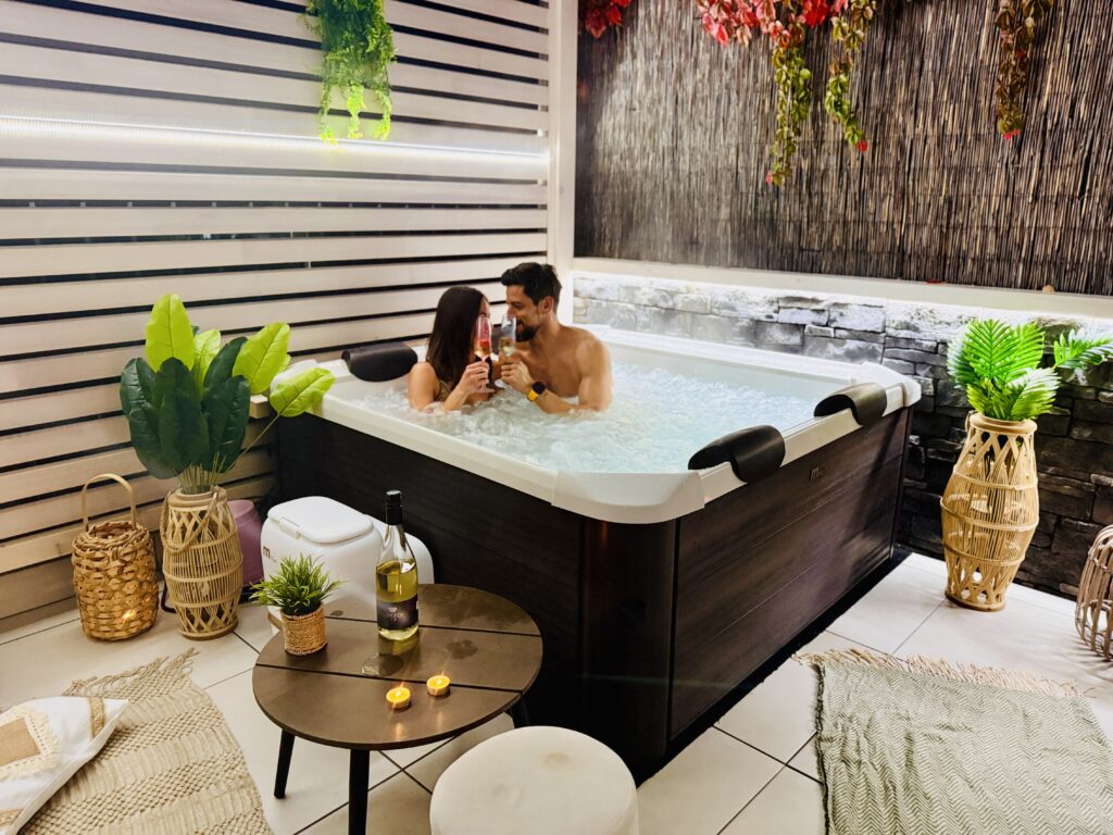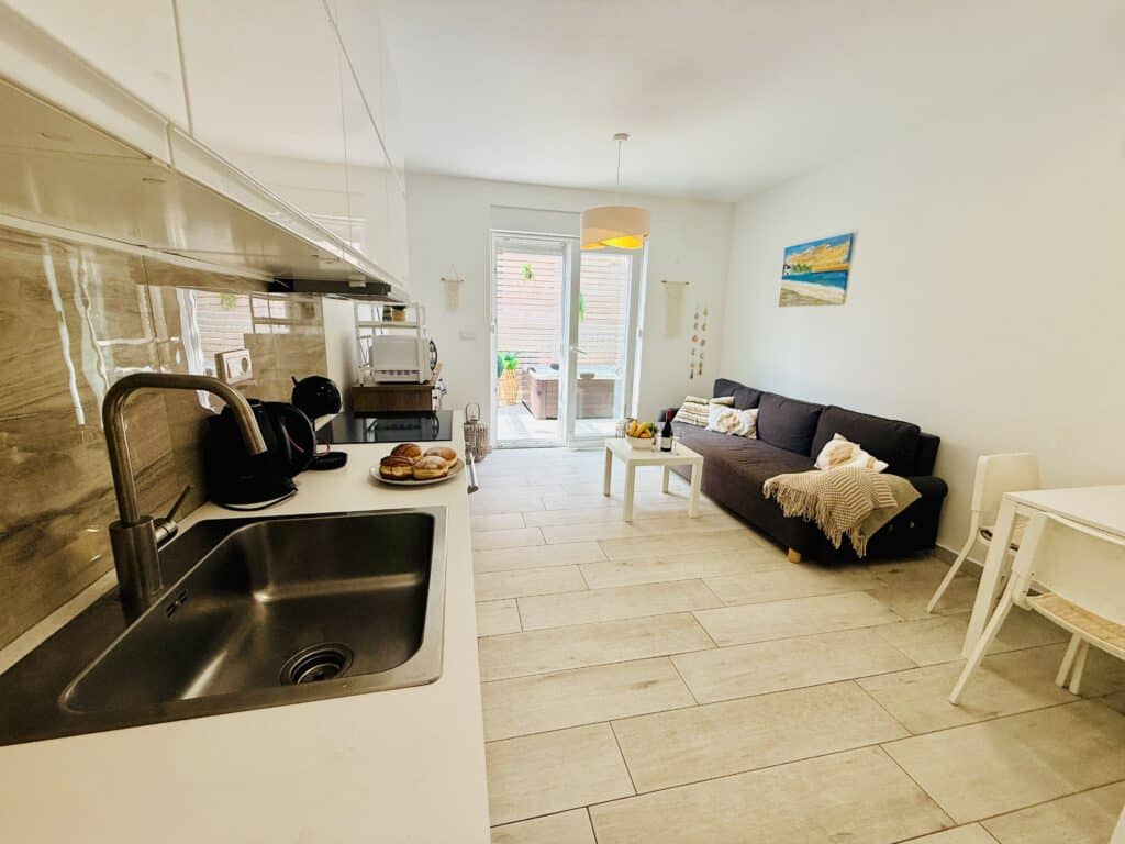 Celoroční dvoupatrový apartmán Happy Home (80 m²) nabízí vše, co potřebujete pro pohodovou dovolenou. V přízemí najdete plně vybavenou kuchyň, útulný obývací prostor s rozkládacím gaučem, koupelnu s WC a hlavně naši zbrusu novou terasou s privátní vířivkou až pro 6 osob. Nová podlaha, pergola, světýlka, zelené detaily a vůně moře vytvářejí jedinečnou, romantickou atmosféru – ideální pro večerní relax při sklence vína nebo ranní kávu v bublinkách.