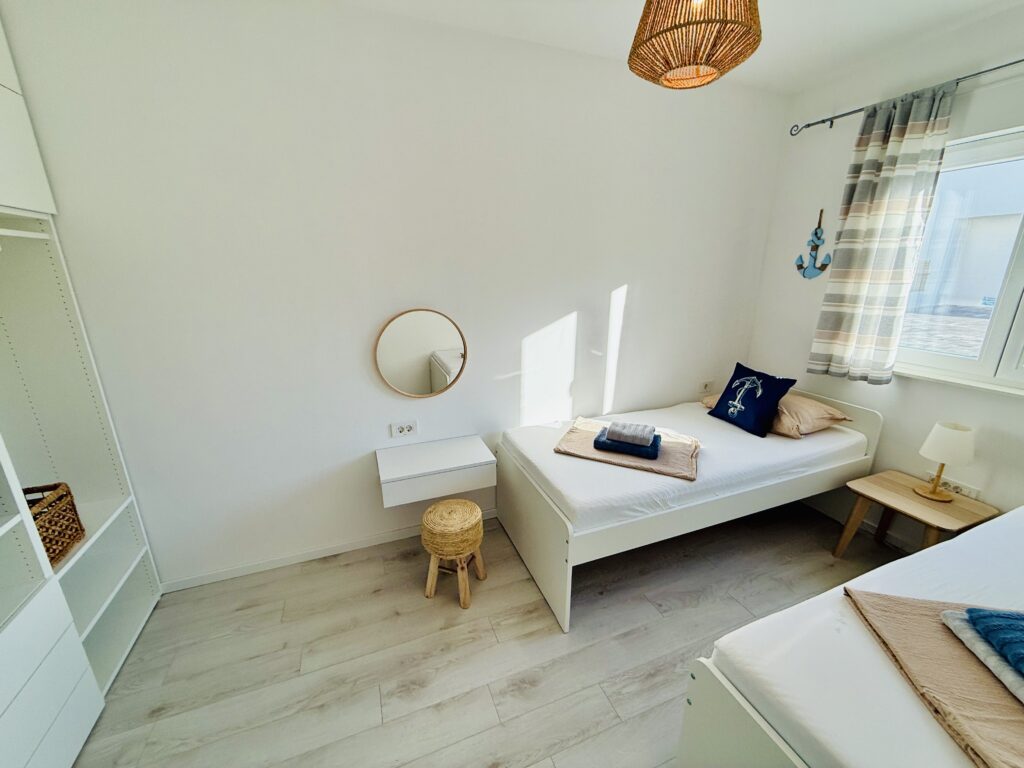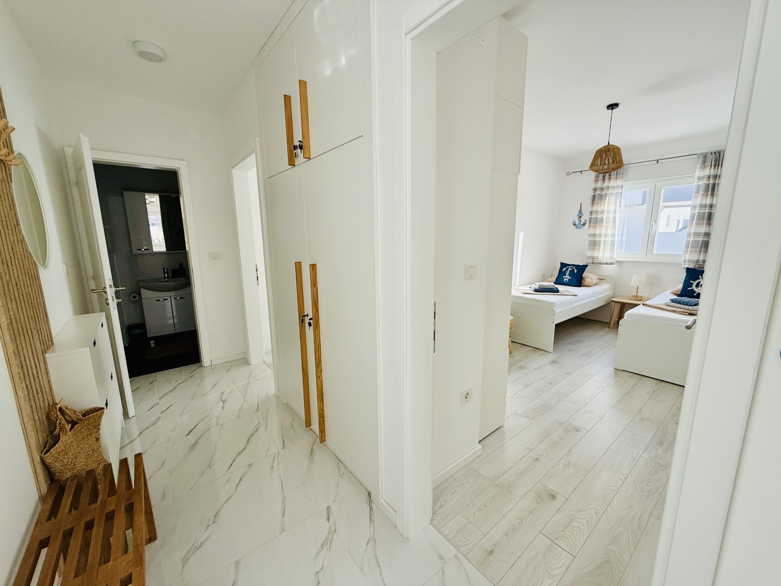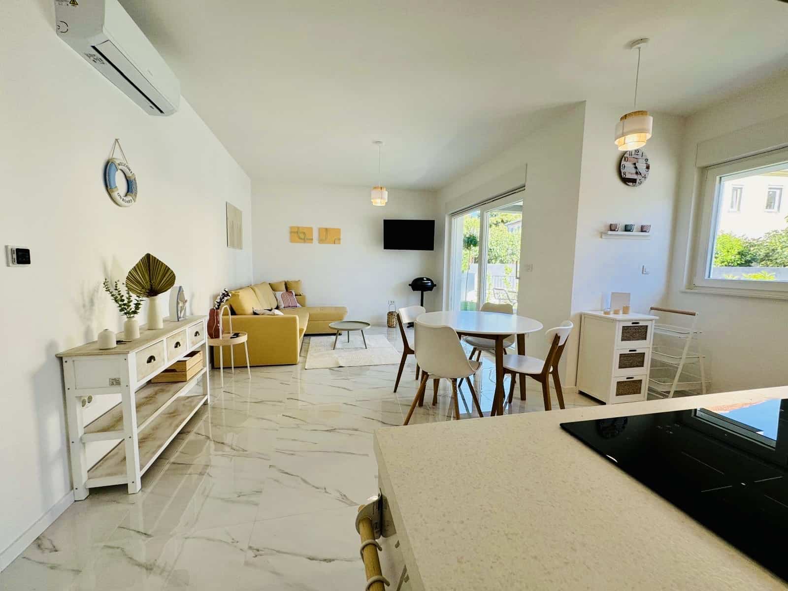 Die Ferienwohnung bietet zwei Schlafzimmer – eines mit Doppelbett und das andere mit zwei Einzelbetten –, eine voll ausgestattete Küche, einen Wohnbereich mit Schlafcouch, ein Badezimmer, eine Terrasse mit Sitzgelegenheiten und einen Garten mit Liegestühlen und Außendusche. Selbstverständlich sind Klimaanlage, WLAN, TV, Grill und Moskitonetze an den Fenstern vorhanden. Ein kostenloses Stand-Up-Paddleboard und ein aufblasbarer Pool stehen ebenfalls zur Verfügung. Ideal für 4 Personen, maximal 6. Hunde sind willkommen. Parkplätze befinden sich direkt vor dem Haus. Der Kiesstrand mit flachem Wasserzugang und einer romantischen Strandbar ist nur wenige Schritte von der Wohnung entfernt und fast vom Garten aus einsehbar. Das Stadtzentrum mit Restaurants, Konditorei, Spielplatz und Sehenswürdigkeiten erreichen Sie nach ca. 100 m.