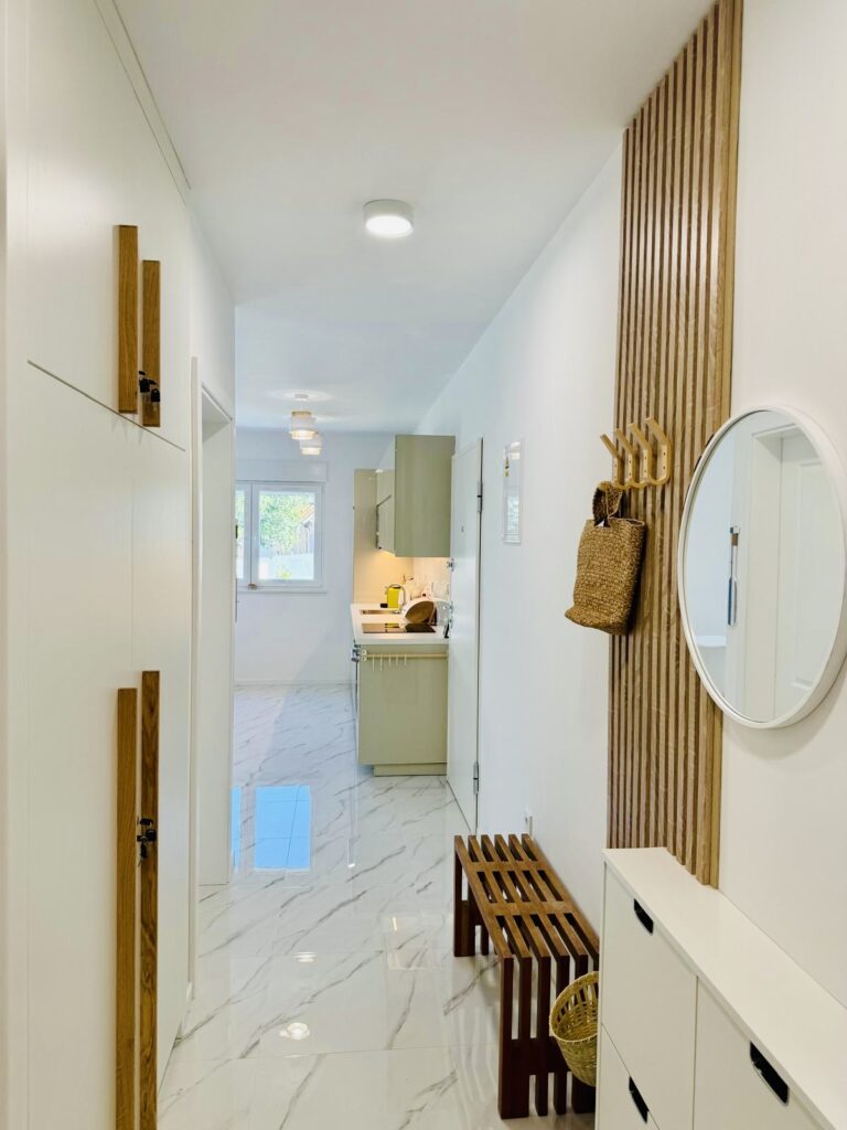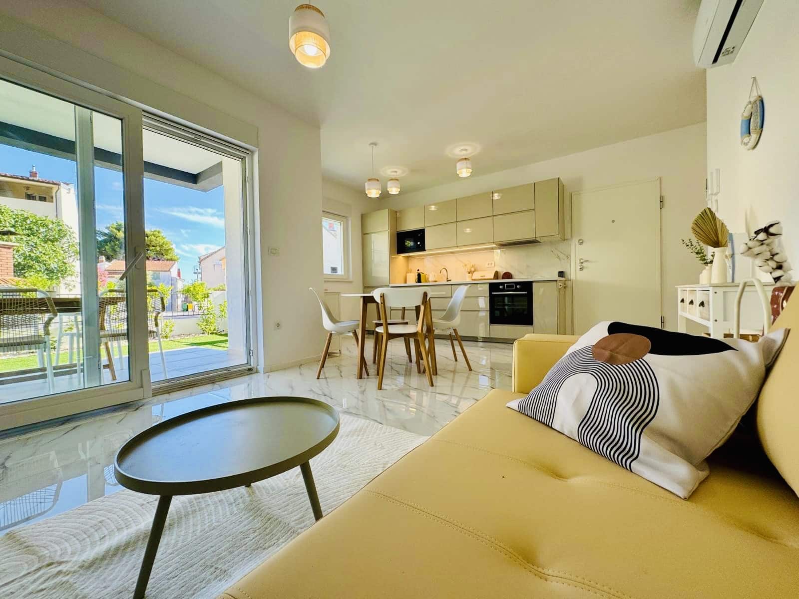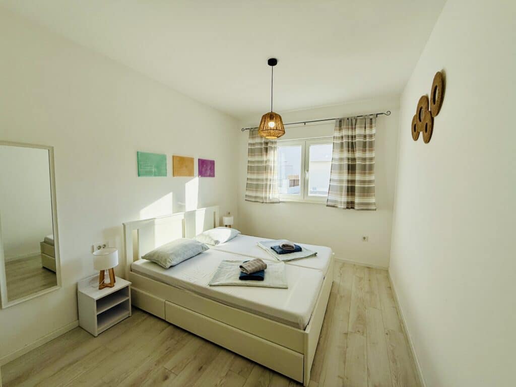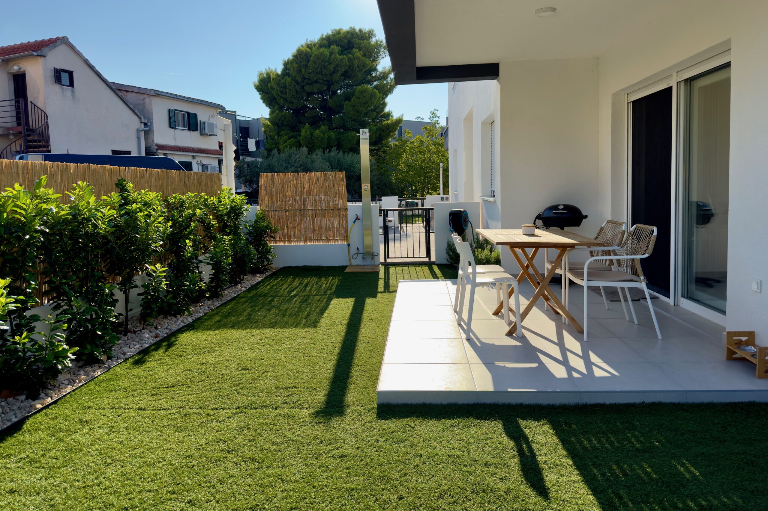 Die Ferienwohnung bietet zwei Schlafzimmer – eines mit Doppelbett und das andere mit zwei Einzelbetten –, eine voll ausgestattete Küche, einen Wohnbereich mit Schlafcouch, ein Badezimmer, eine Terrasse mit Sitzgelegenheiten und einen Garten mit Liegestühlen und Außendusche. Selbstverständlich sind Klimaanlage, WLAN, TV, Grill und Moskitonetze an den Fenstern vorhanden. Ein kostenloses Stand-Up-Paddleboard und ein aufblasbarer Pool stehen ebenfalls zur Verfügung. Ideal für 4 Personen, maximal 6. Hunde sind willkommen. Parkplätze befinden sich direkt vor dem Haus. Der Kiesstrand mit flachem Wasserzugang und einer romantischen Strandbar ist nur wenige Schritte von der Wohnung entfernt und fast vom Garten aus einsehbar. Das Stadtzentrum mit Restaurants, Konditorei, Spielplatz und Sehenswürdigkeiten erreichen Sie nach ca. 100 m.