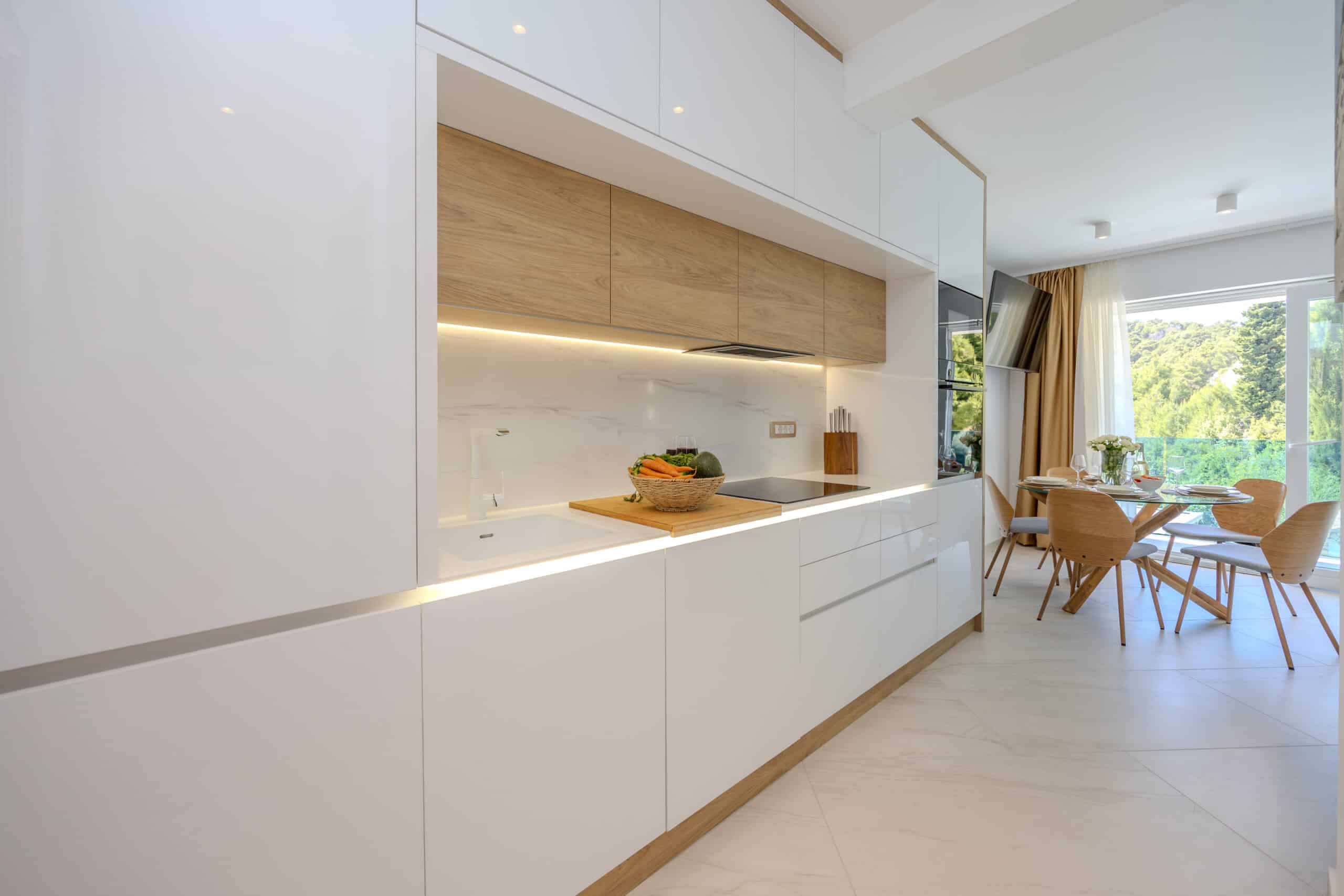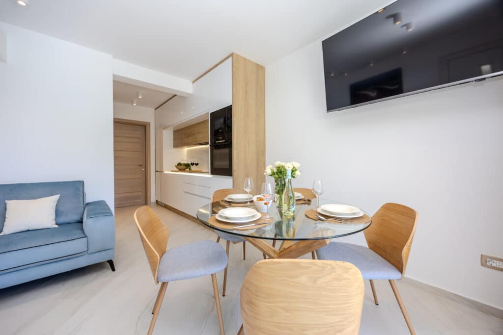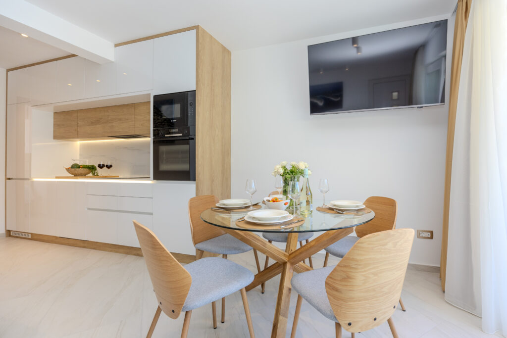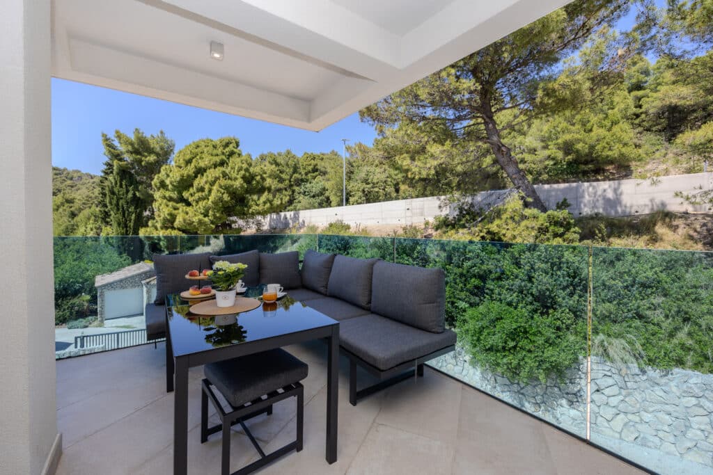 Apartmán Silver s terasou a výhledem na moře se nachází ve 2. patře a má prostorný obývací pokoj s plně vybavenou moderní kuchyní s myčkou nádobí. Dvě ložnice, přičemž každá má klimatizaci a podlahové vytápění. Super kvalitní matrace na postelích jsou zárukou odpočinkové dovolené. V koupelně je sprchový kout, fén a samozřejmě pračka. V apartmánu nechybí velkoplošná TV a rychlá wifi. Na terase je k dispozici posezení, lehátka a slunečník.
