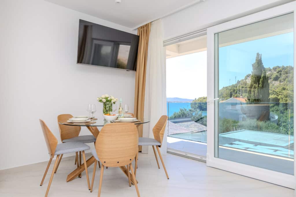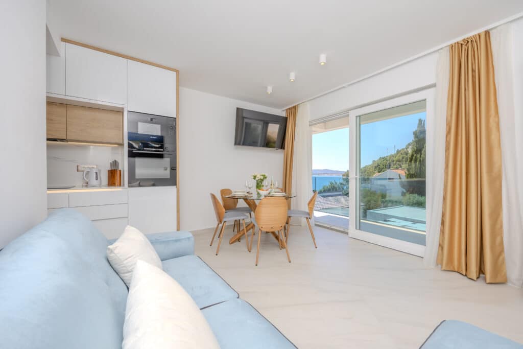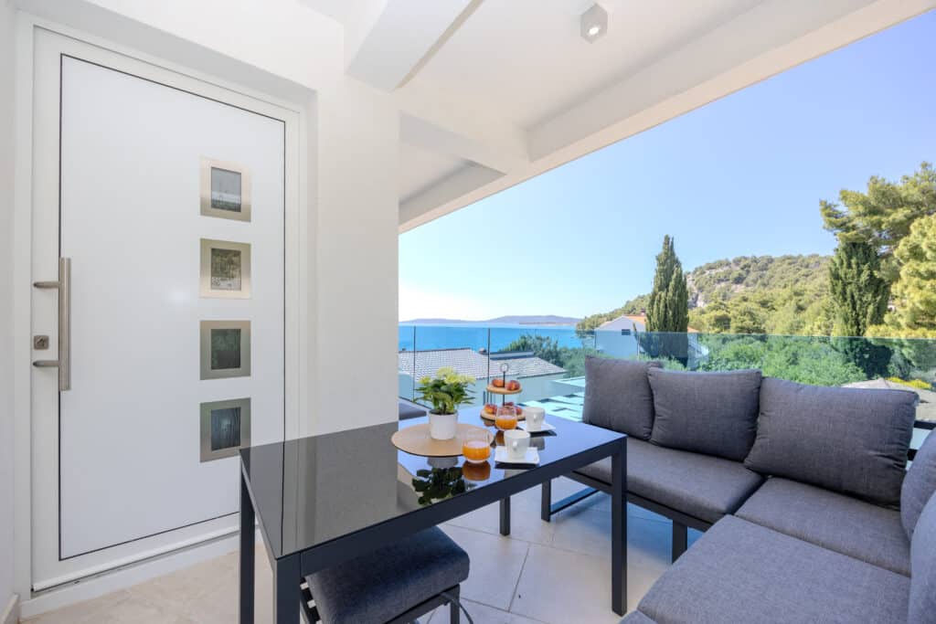 Všechny apartmány ve Ville Blue Vás nechají stát v němém úžasu, jen do nich vstoupíte… Tak čisté, tak moderní, tak pohodlné, s obrovskou terasou a nejkrásnějším výhledem na moře, jaký si jen dokážete představit. Nepřeháníme. Tohle je prostě sen. K dispozici Vám je navíc kdykoliv vyhřívaný bazén, vířivka, gril. A pláž? Ta nejkrásnější ze Žaboriče, přírodní písečná, na některých místech s drobnými kamínky, je od apartmánu pouhých 20 kroků. Ráj pro děti! Paddleboard máte samozřejmě k dispozici zdarma, stejně jako lehátka na pláži a slunečník. Pejsci vítáni 🙂