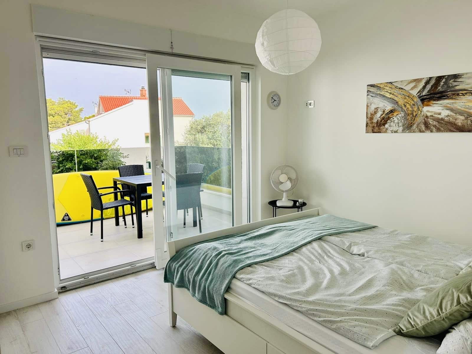 Apartmán nabízí 2 ložnice, plně vybavenou kuchyň, obývací prostor s rozkládací pohovkou, jednu koupelnu a terasu s posezením a grilem. Samozřejmostí je klimatizace, WIFI, TV, moskytiéry v oknech. K dispozici je zdarma paddleboard. Ideální pro 4 osoby, maximálně pro 6. Pejsky vítáme. Parkování hned před domem. Kamínková pláž s mírným přístupem do vody a s romantickým plážovým bárkem je vzdálená pár kroků od apartmánu. Centrum města s restauracemi, cukrárnou, dětským hřištěm a atrakcemi jsou vzdáleny cca 100 m a máte na něj parádní výhled z terasy.