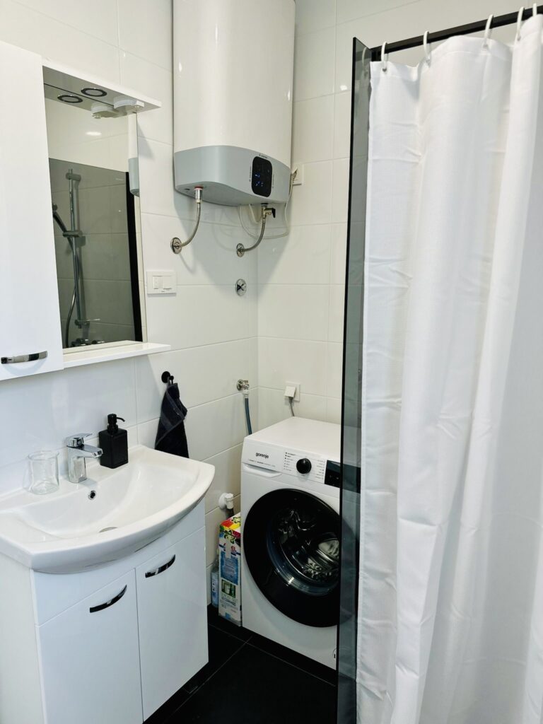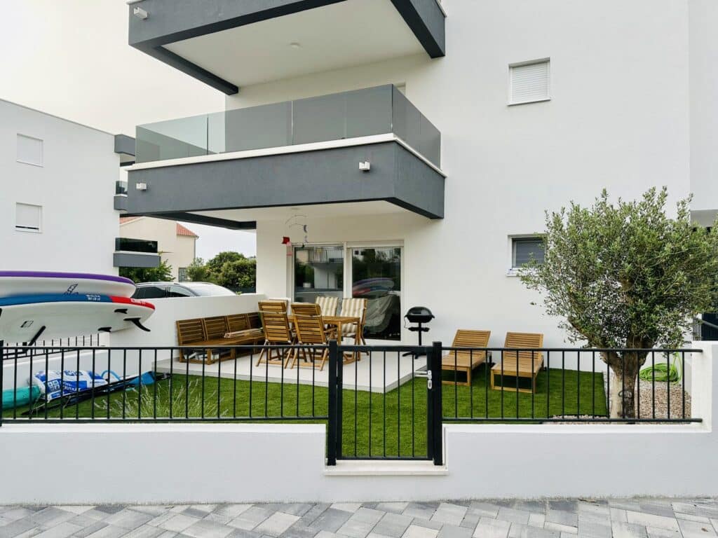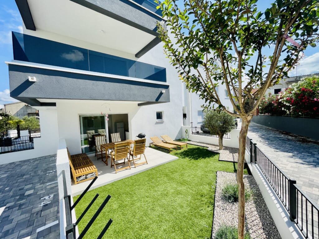 Zcela nový přízemní apartmán s vlastní oplocenou zahrádkou jen 40 metrů od pláže. Apartmán se nachází v moderním projektu Aqua Beach Residence ve 2. řadě od moře. Jedná se o klidné a bezpečné místo, ideální pro rodiny s dětmi. Do centra městečka přitom dojdete za dvě minuty podél moře.