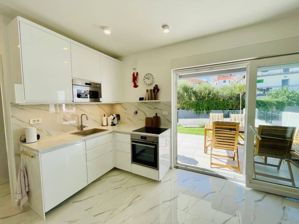 Apartmán nabízí 1 ložnici s manželskou postelí, plně vybavenou kuchyň, obývací prostor s rozkládací pohovkou, která se dá snadno změnit na pohodlné dvoulůžko, jednu koupelnu, terasu s posezením a zahradu s lehátky. Samozřejmostí je klimatizace, WIFI, TV, gril, moskytiéry v oknech. K dispozici je zdarma paddleboard. Ideální pro 2 až 4 osoby. Pejsky vítáme. Parkování hned před domem. Kamínková pláž s mírným přístupem do vody a s romantickým plážovým bárkem je vzdálená pár kroků od apartmánu, v podstatě na ni koukáte ze zahrady. Centrum města s restauracemi, cukrárnou, dětským hřištěm a atrakcemi jsou vzdáleny cca 100 m.
