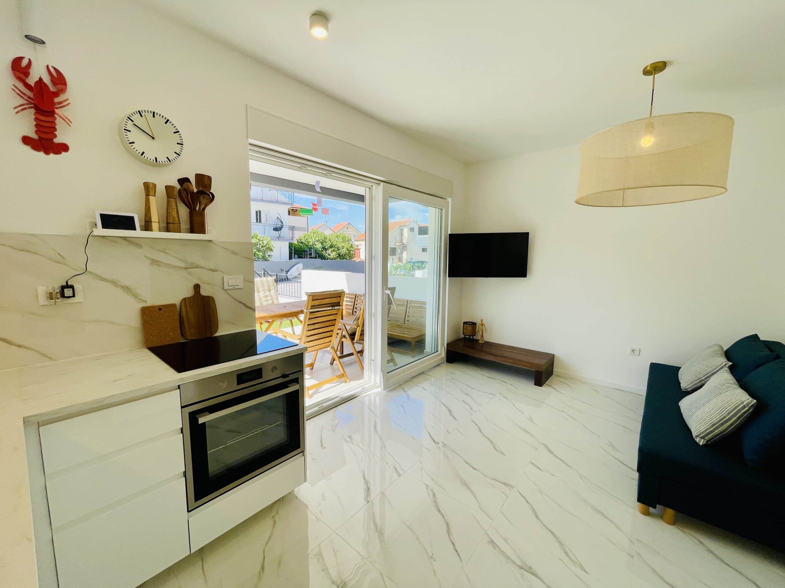 Apartmán nabízí 1 ložnici s manželskou postelí, plně vybavenou kuchyň, obývací prostor s rozkládací pohovkou, která se dá snadno změnit na pohodlné dvoulůžko, jednu koupelnu, terasu s posezením a zahradu s lehátky. Samozřejmostí je klimatizace, WIFI, TV, gril, moskytiéry v oknech. K dispozici je zdarma paddleboard. Ideální pro 2 až 4 osoby. Pejsky vítáme. Parkování hned před domem. Kamínková pláž s mírným přístupem do vody a s romantickým plážovým bárkem je vzdálená pár kroků od apartmánu, v podstatě na ni koukáte ze zahrady. Centrum města s restauracemi, cukrárnou, dětským hřištěm a atrakcemi jsou vzdáleny cca 100 m.