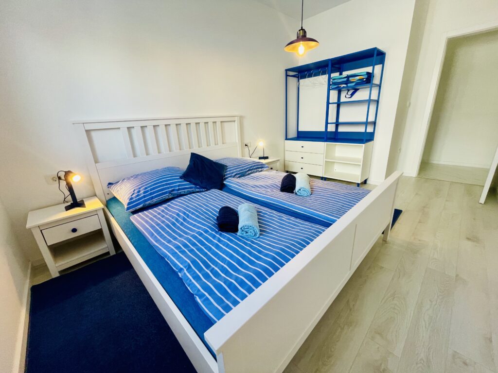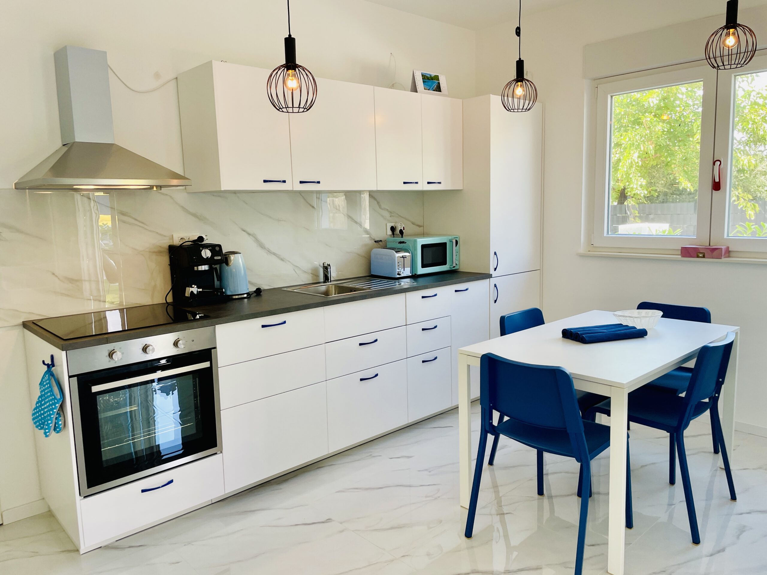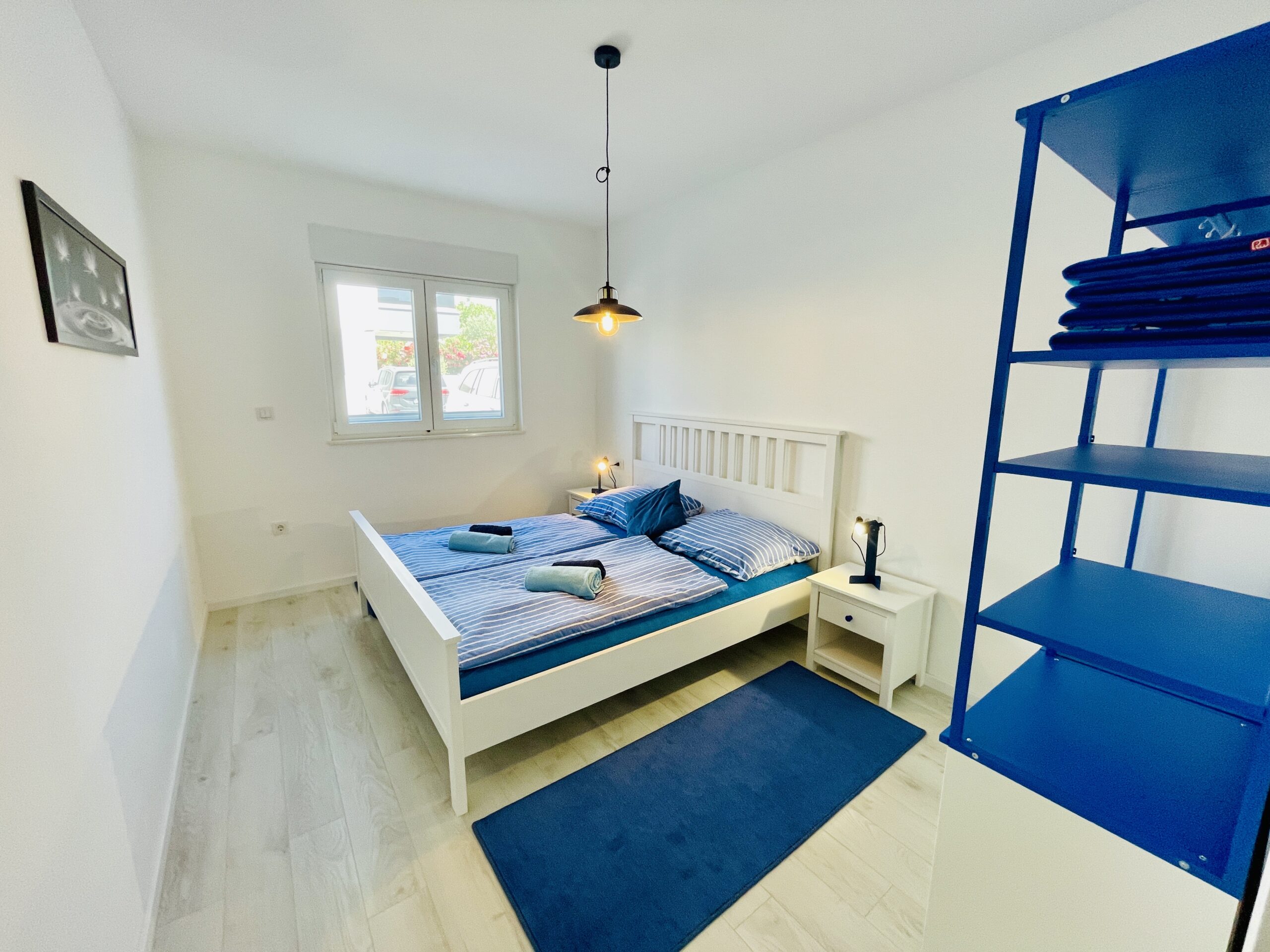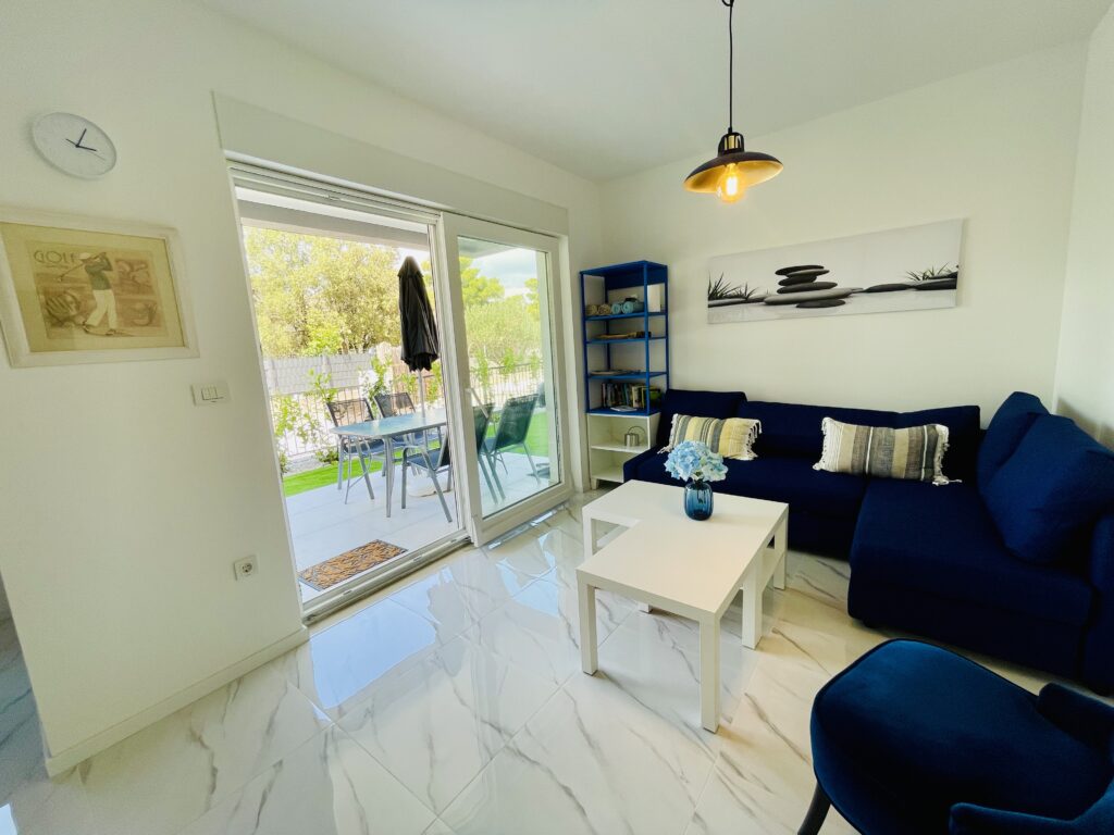 Apartmán nabízí 2 ložnice – jednu s manželskou postelí a druhou se dvěma oddělenými postelemi, plně vybavenou kuchyň, obývací prostor s rozkládací pohovkou, jednu koupelnu, terasu s posezením a zahradu s lehátky a venkovní sprchou. Samozřejmostí je klimatizace, WIFI, TV, gril, moskytiéry v oknech. K dispozici je zdarma paddleboard. Ideální pro 4 osoby, maximálně pro 6. Pejsky vítáme. Parkování hned před domem. Kamínková pláž s mírným přístupem do vody a s romantickým plážovým bárkem je vzdálená pár kroků od apartmánu. Centrum města s restauracemi, cukrárnou, dětským hřištěm a atrakcemi jsou vzdáleny cca 250 m.